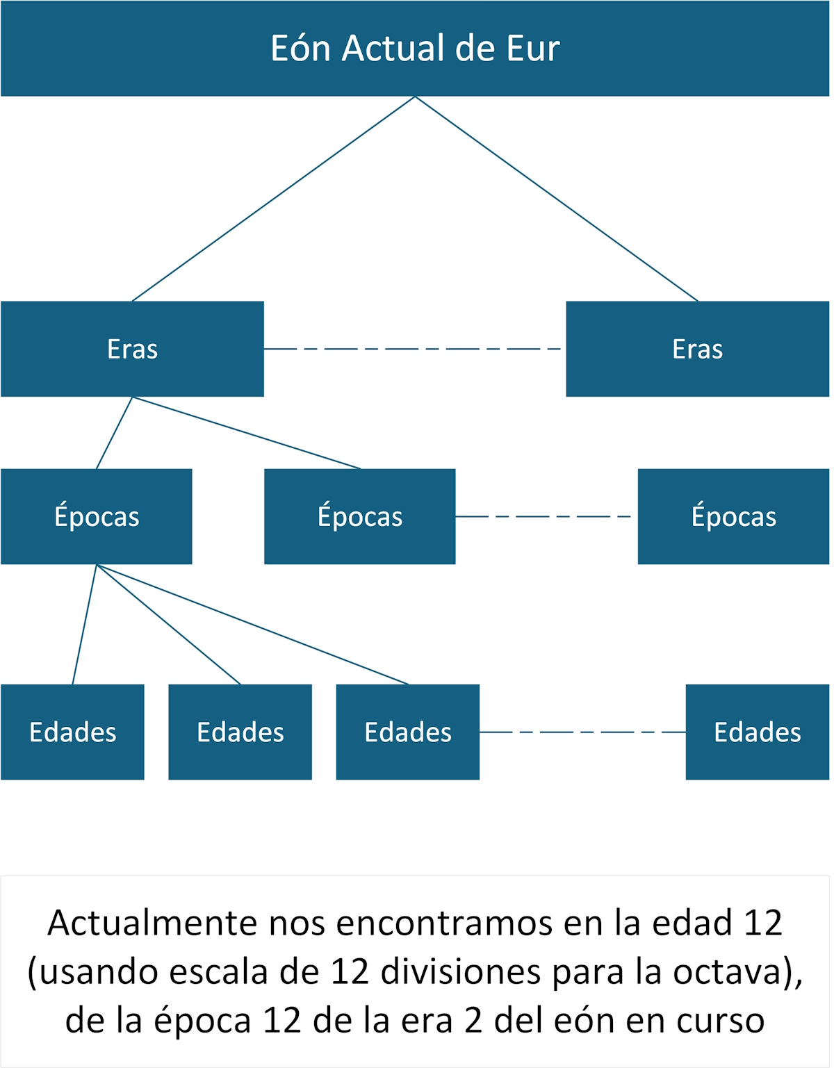Esto no significa que la era dure más o menos tiempo según la dividas en más o menos trozos, simplemente hay seres, razas o grupos que dirán que están en la era 4 de 12 del eón actual, para indicar que están en el RE#, y otros que dirán que están en la era 2 de 7 para indicar ese mismo punto del eón actual (siendo el RE# para ellos parte de la nota RE en su conjunto). Como esto puede llevar a confusión en calendarios “galácticos” cuando muchas razas se juntan, colaboran o trabajan en coordinación, o incluso cuando las propias jerarquías logóicas colaboran con diferentes especies en sus procesos evolutivos, existen acuerdos que marcan un estándar a nivel de “tiempos” y “medidas cíclicas” para todo Eur, y es algo así como cuando en series tipo Star Trek te dicen que la “fecha estelar” es tal o cual, y esa “fecha estelar” es la misma para todas las especies que se adhieren a un calendario y metodología de medidas temporales común para cada galaxia.