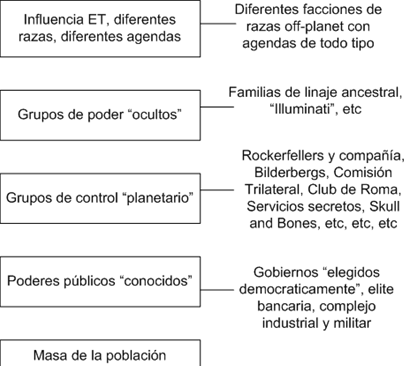 No tiene mucho misterio, lo único que a alguien que no esté metido en estas cosas le pueda chocar sea quizás la parte de influencias extraterrestres, lo demás creo que es de dominio público. Los grupos anteriores se solapan en ciertas áreas y las líneas pueden ser difusas entre dónde empieza uno y acaba el otro, pero normalmente los de arriba dictan la agenda a los de abajo.